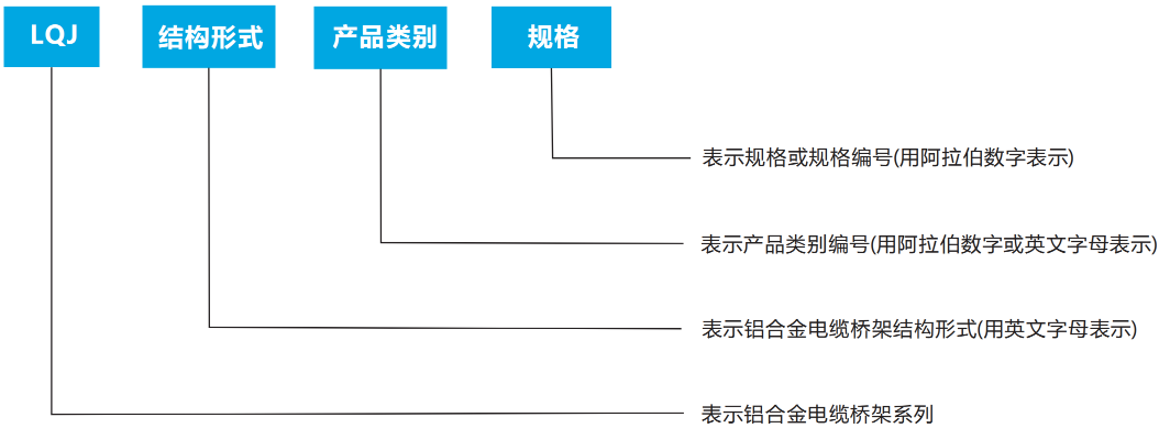 铝合金电缆桥架在某种结构形式中无其它结构形式中的某一种产品类别,选型可作代用表示。如:在LQU-CC型槽式铝合金电缆桥架结构形式中,无铝合金配线桥架中的LPC-03D上边垂直三通接头,此时在选型编写时原系列,结构形式、规格不变,只取产品类别编号03D,即表示为LQJ-CC-03D。