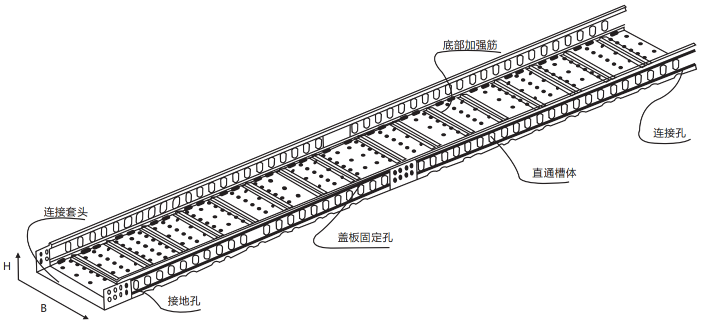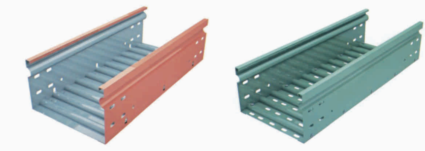大型工业厂房往往采用混凝士管架及钢结构作为桥架两端支撑点,其跨距已往往超过电缆桥架2米的长度,故需求长跨距桥架来满足安装需求,一般需要受力侧板增加几倍厚度来满足载荷要求。我公司采用在槽盒托盘的内侧两翼,选用不用规格不同厚度的半圆型加强筋,合理计算电缆桥架的额定均布负载值,用冲压设备固定在槽盒托盘两翼。该产品具有自重轻、支撑跨距大、载荷能力强的特点。