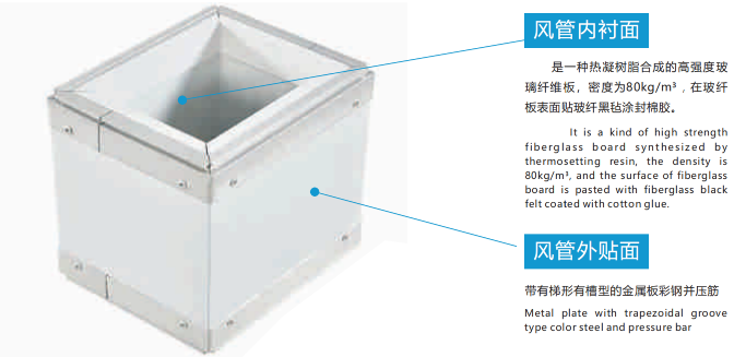 该风管为高效保温、减震、消声成品一体化风管,完全无机材料,防火真正达到不燃A1级。彻底解决了您买聚苯彩钢,酚醛的毒性和防火性(B)以及老化问题;同时精密数控技术彻底解决了人工制作风管的各种缺陷和产能限制,也彻底解决空调系统的漏风结露防火问题。